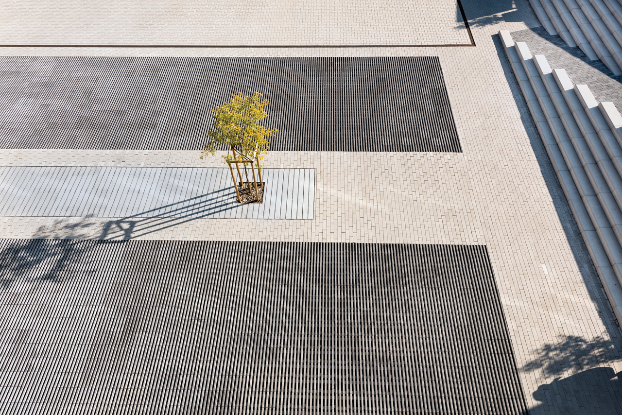 The linear lines give way at regular intervals to bell shaped openings allowing surface water to drain though the slabs.