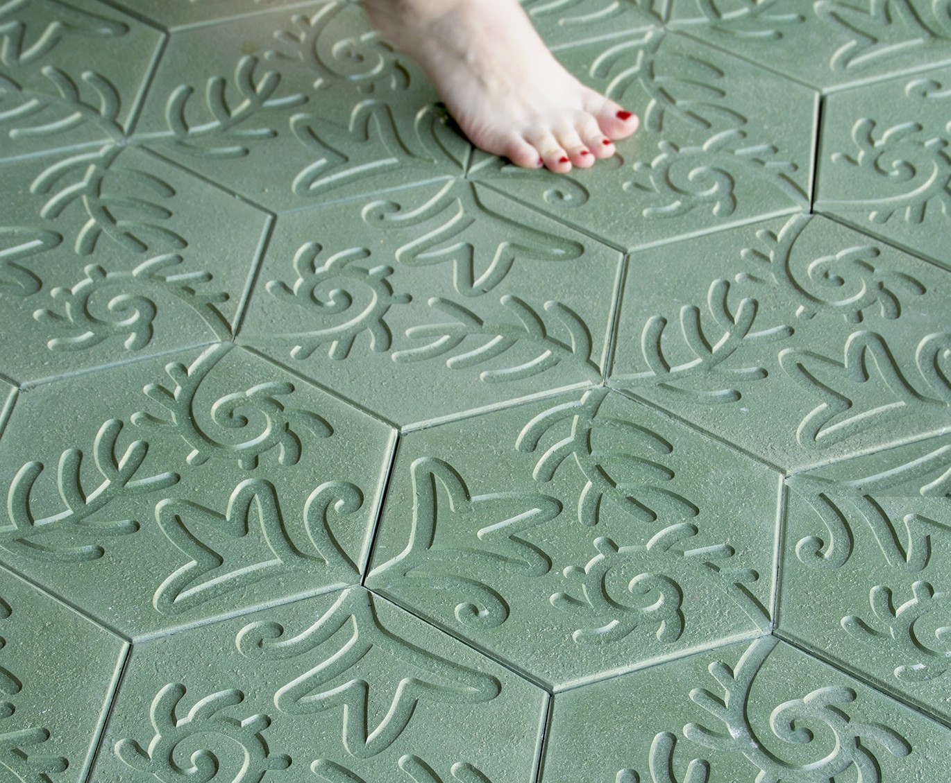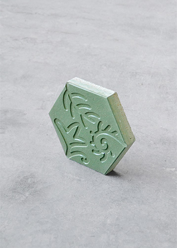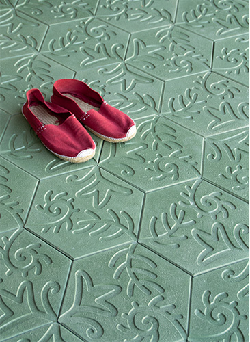 The Moderna Vibrazolit® relief tile reproduces three floral motifs anchored in the vertices of the hexagon. Its placement enables composition of homogeneous or random patterns according to the layout of the tiles on the surface.