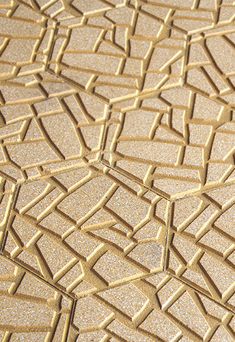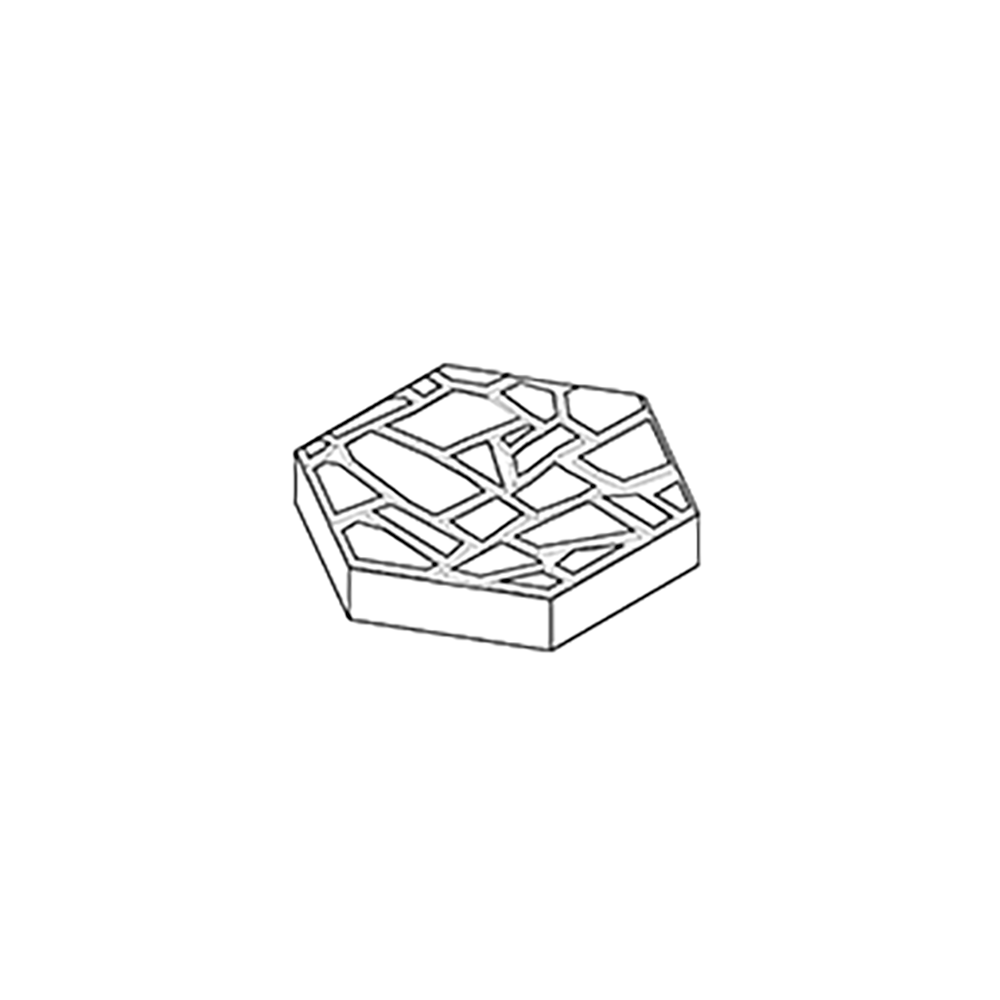 Randomly placed, the morphology of its fragmented relief is imposed on the cut hexagonal format. The smoothed Vibrazolux® texture reveals the aggregate on the surface of the fractured plateaus, a second reinterpretation of the original pavement on a smaller scale.