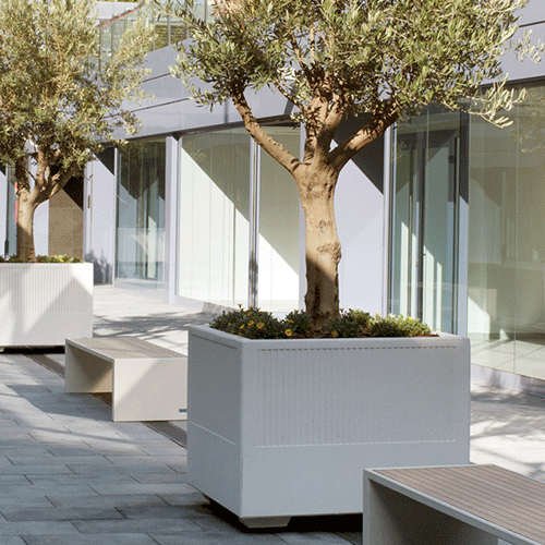 Icaria was designed in 1991 by the architect Esteve Bonell in conjunction with Escofet as a garden element in the walkway that leads to the houses in a housing block of the Olympic Village in Barcelona. Its cubic geometry lends strength to its structure, allowing it to be moved even when filled with soil, without affecting the plants that grow inside it.
